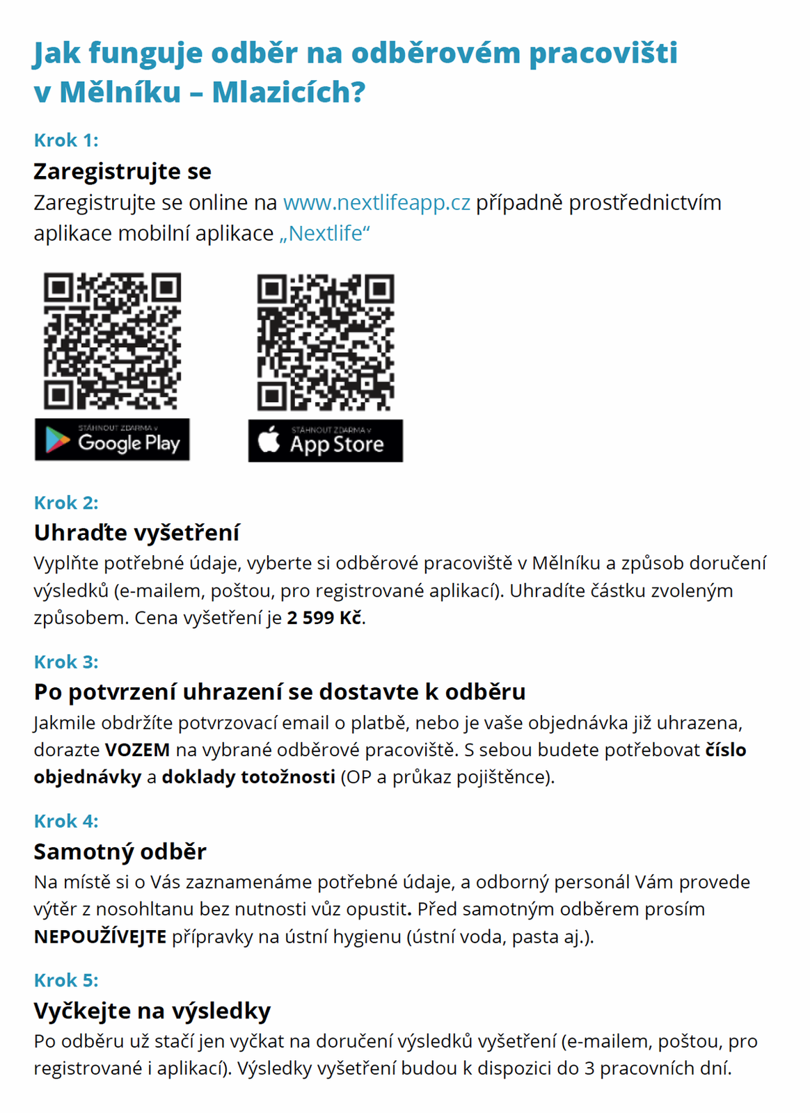 Skupina NEXTCLINICS ve spolupráci s vedením města Mělníka a zdravotně preventivní on-line platformou NEXTLIFE (www.nextlifeapp.cz) připravila možnost testování na infekci koronavirem SARS-CoV-2 (onemocnění COVID 19) pro samoplátce. Cena vyšetření je 2 599 Kč.