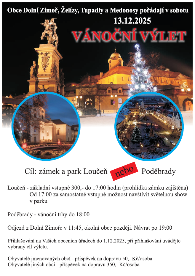 Obce Dolní Zimoř, Želízy, Tupadly a Medonosy zvou své občany na předvánoční výlet, který se bude konat 13.12.2025.